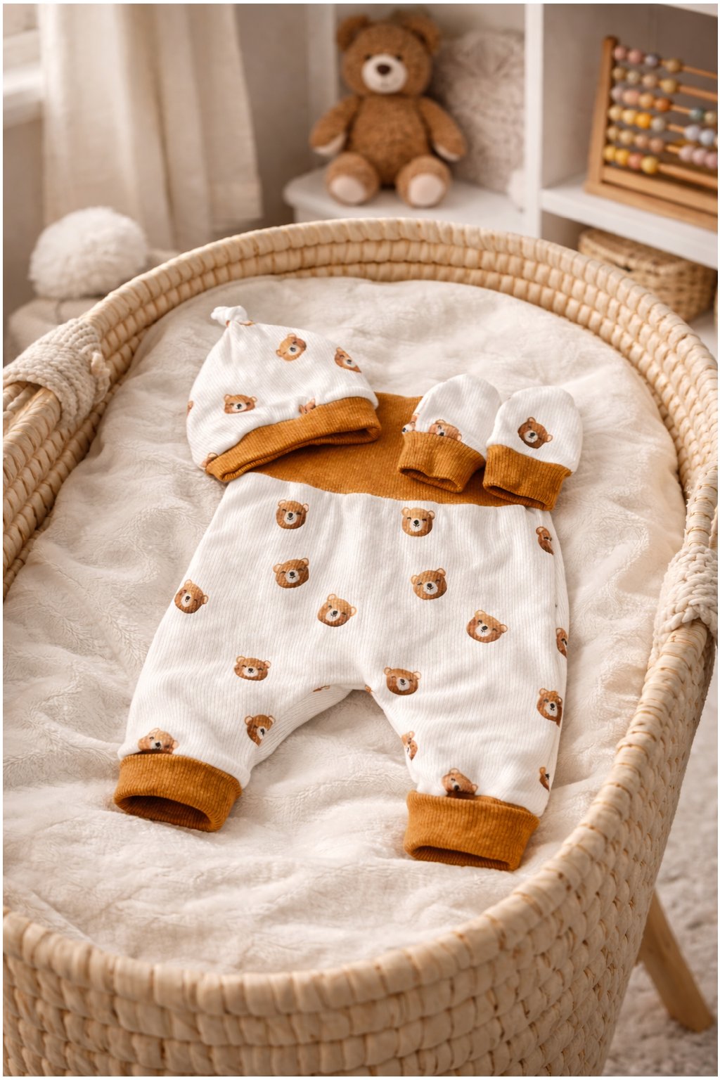 Celý komplet je navržen a ušit s důrazem na maximální pohodlí a jemnost k citlivé dětské pokožce. Harémky jsou doplněny slušivou čepičkou s uzlíkem a praktickými rukavičkami.